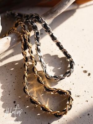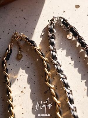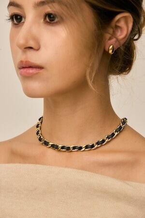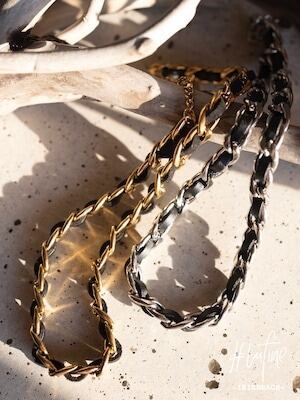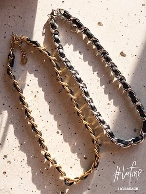 レザーがチェーンに編み込まれたデザインが特徴的なネックレス。